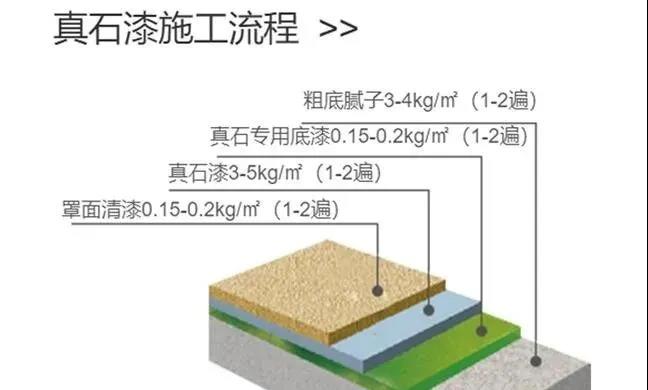 1、抗堿底漆 2、真石漆主材 3、自潔性罩面漆。