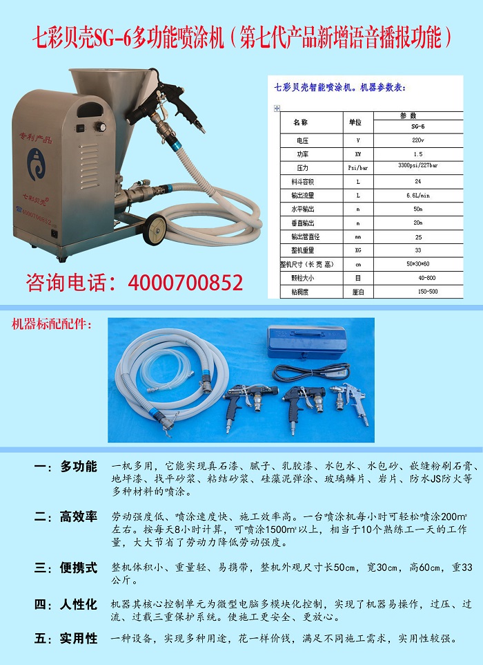 一機(jī)多用,它能實(shí)現(xiàn)真石漆、質(zhì)感、膩?zhàn)、粉刷石膏、乳膠漆、底漆、油漆、地坪漆、找平砂漿、粘結(jié)砂漿、掛網(wǎng)砂漿、硅藻泥、彈涂、玻璃鱗片、巖片、防水JS防火、保溫材料、單組份聚氨酯等十多種材料的噴涂。噴涂厚度為1-10mm(也可以根據(jù)噴槍走的快慢來(lái)調(diào)整噴涂厚度)噴射寬度30-50CM。